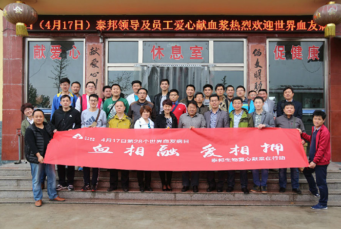 2016年4月16-17日,為迎接第28個(gè)世界血友病日的到來(lái),山東泰邦生物制品有限公司組織員工五十余人到寧陽(yáng)漿站舉行了捐獻血漿公益活動(dòng)?;顒?dòng)以血相融 愛(ài)相擁為主題,旨...